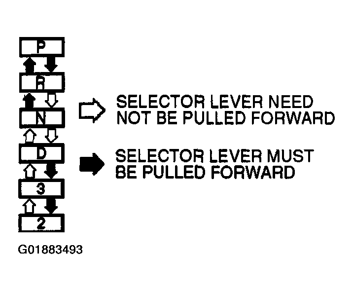 - With the brake pedal depressed, verify that there is a "click" at each range when shifted in the pattern shown.