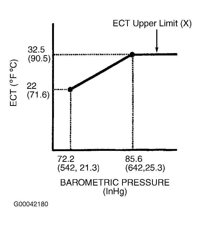 - Engine coolant temperature: 14-X°F (-10-X°C). X = engine coolant temperature upper limit as determined by barometric pressure shown in graph. See Figure.
