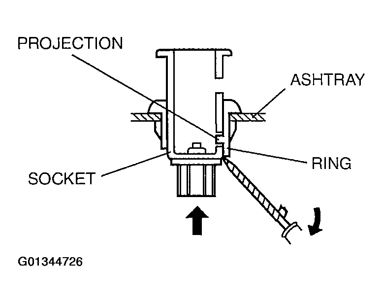 - From the rear of the ashtray, insert a tape-wrapped Flathead screwdriver between the socket and the ring as shown. See Fig 3.