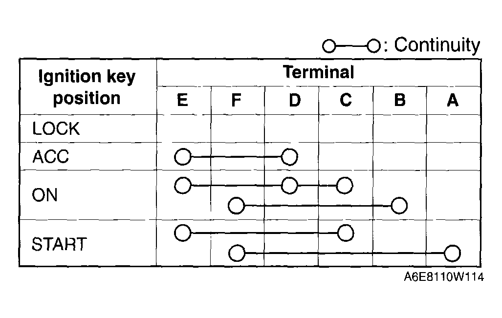 Verify that the continuity between the ignition switch terminals is as indicated in