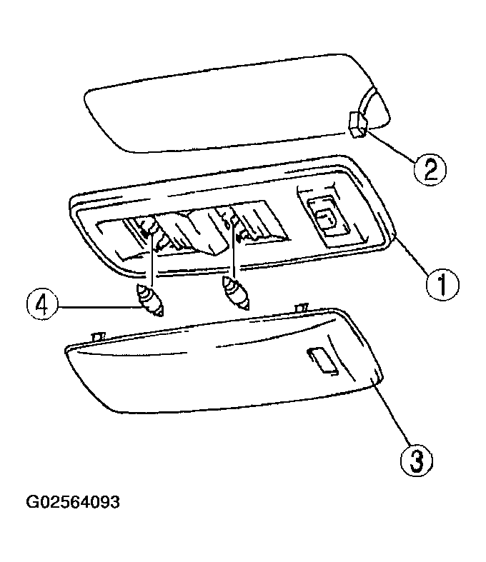 Component/Step No. Component Description 1 Interior Light 2 Connector 3 Lens (See LENS REMOVAL NOTE ) 4 Interior Light Bulb (1) See Fig 1. - Install in the reverse order of removal.