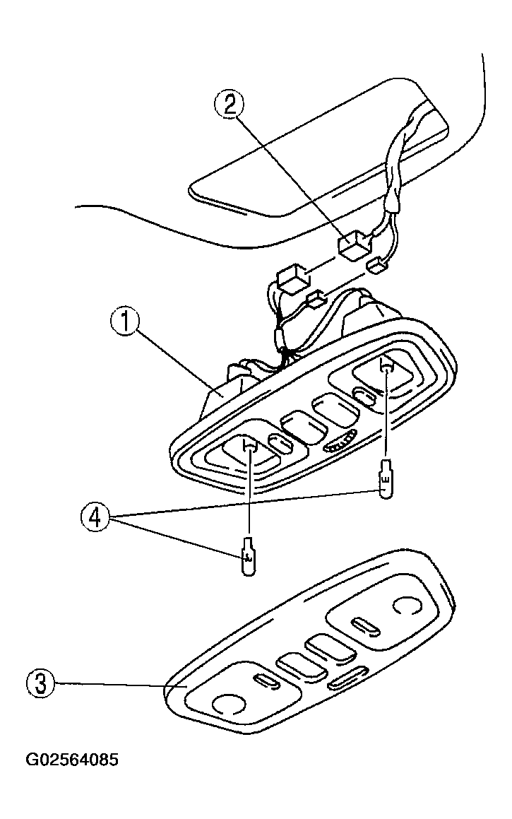 Component/Step No. Component Description 1 Map light 2 Connector 3 Lens (See LENS REMOVAL NOTE ) 4 Map light bulb (1) See Fig 1. - Install in the reverse order of removal.
