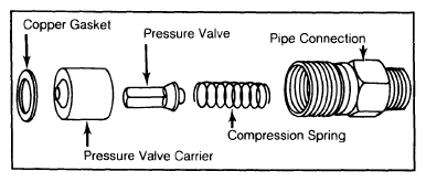 - Clean pump connections. Remove vacuum hoses from pump. Remove No. 1 injection line, then unscrew pipe connection and remove compression spring and pressure valve. Leave pressure valve carrier and copper gasket in place. See Fig 1.CAUTION: Do not unscrew element connection below pipe connection or pump recalibration will be necessary.
