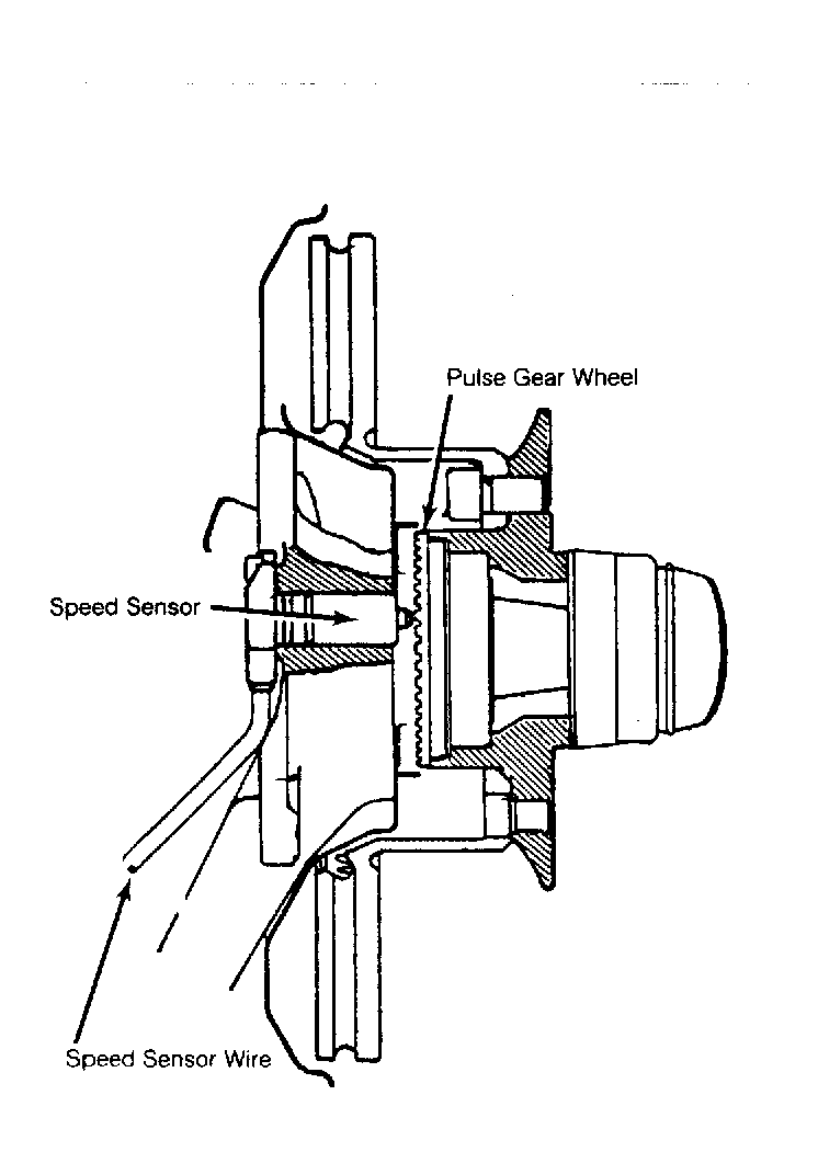 Speed sensors consist of magnetic core and coil. Rotation of rotor, set specific distance from sensor, causes alternating voltage in coil. This alternating voltage changes frequently in proportion to wheel speed and number of rotor teeth.