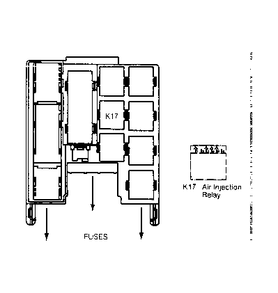 Air injection system works to reduce exhaust emissions and improve driveability. Control unit engages and disengages air pump through an air injection relay, located in relay box next to brake master cylinder. SeeFig 1 .