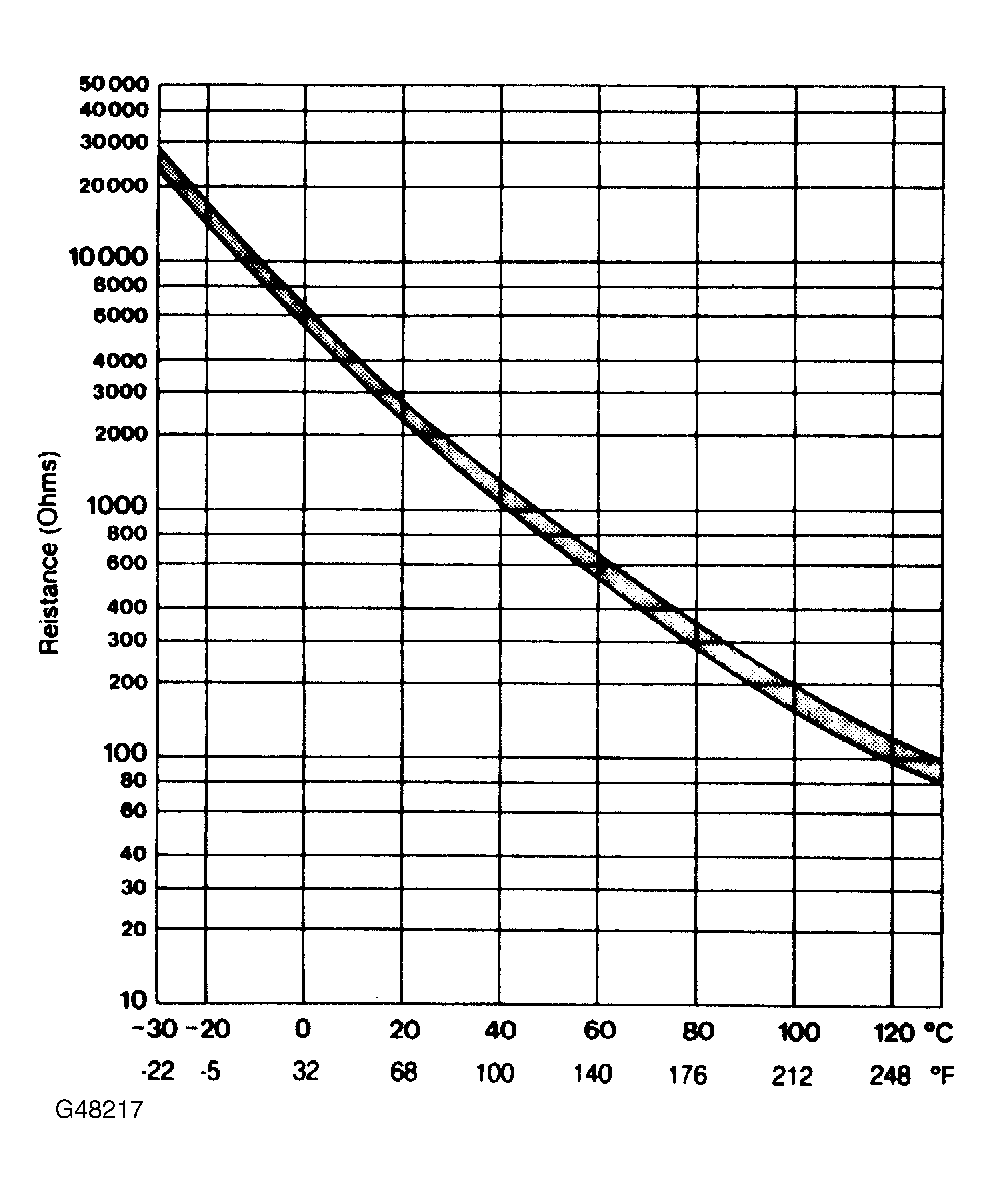 7. Unplug coolant temperature sensor. Test resistance from sensor terminal to ground. Test resistance at 2 different temperatures. If not within specifications, replace sensor. See Figure . If values are okay, go to next step.