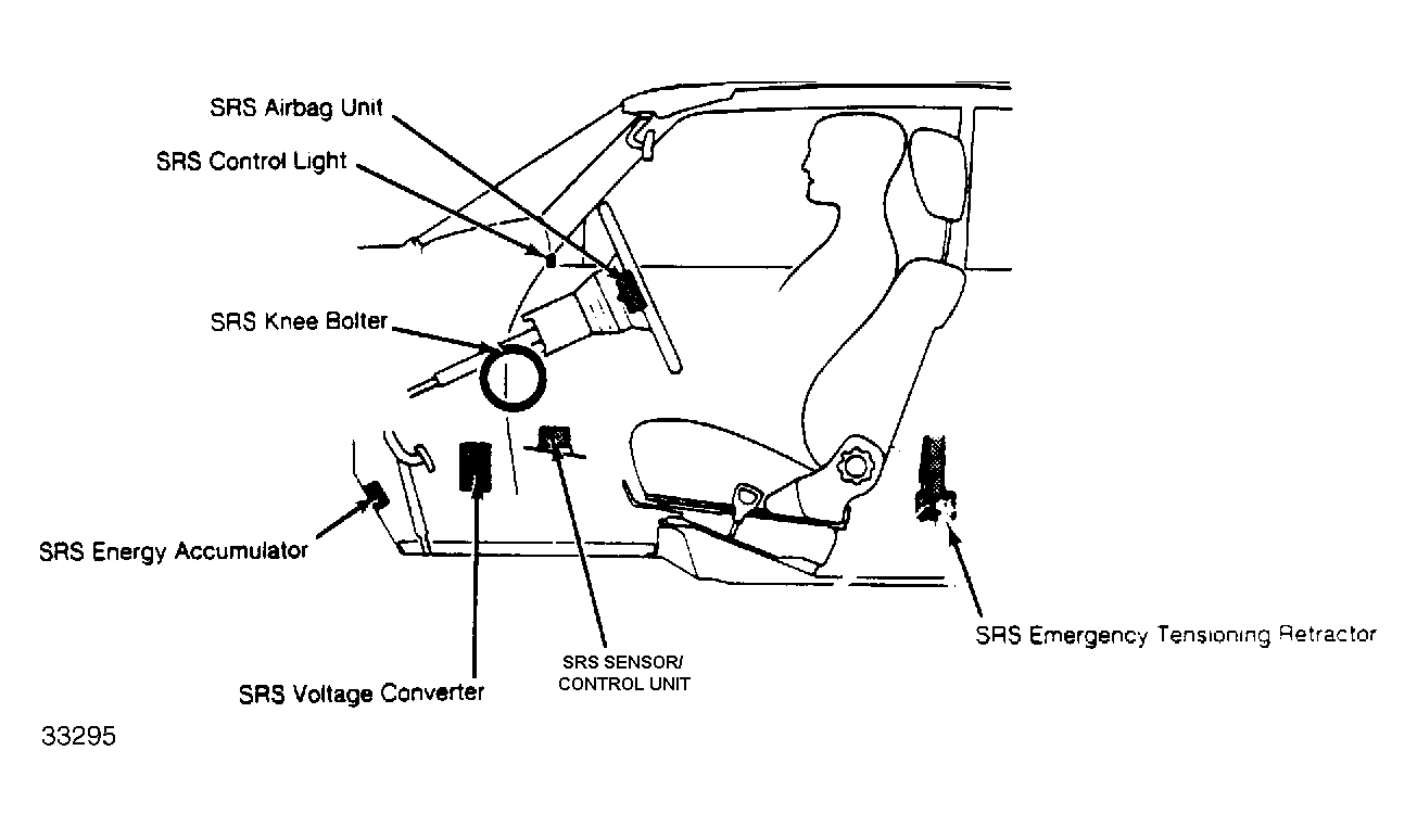 | SRS Control Unit/Sensor | Under center console, forward of shifter, bolted to transmission tunnel. See Figure . |