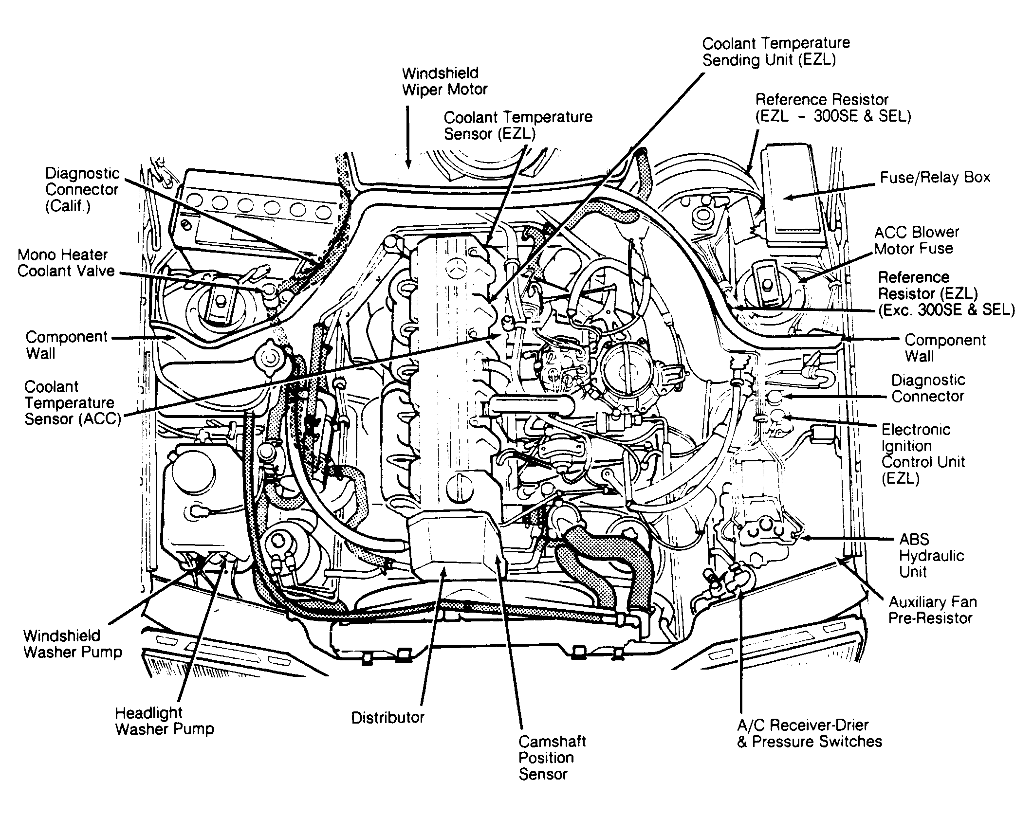 | 300 SE, SEL, SL | Behind right kick panel. | |