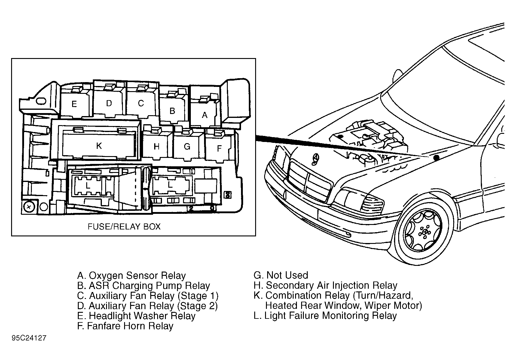 | Fuse/Relay Box | Left rear corner of engine compartment. See Figure. |