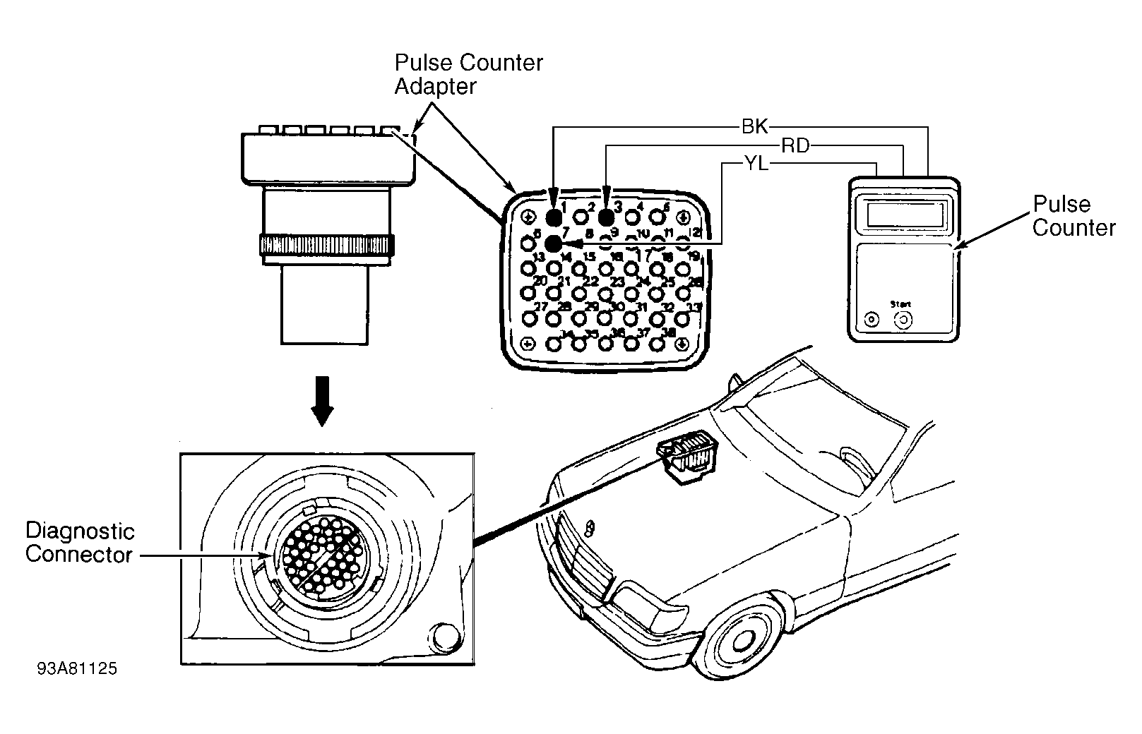 1. Disconnecting vehicle battery will not erase codes. Connect Pulse Counter Adapter (140 589 14 63 00) to diagnostic connector, located in right rear corner of engine compartment. Connect Pulse Counter (124 589 19 21 00) to pulse counter adapter. See Figure . Connect Red wire of pulse counter to pulse counter adapter terminal No. 3. Connect Black wire of pulse counter to pulse counter adapter terminal No. 1.