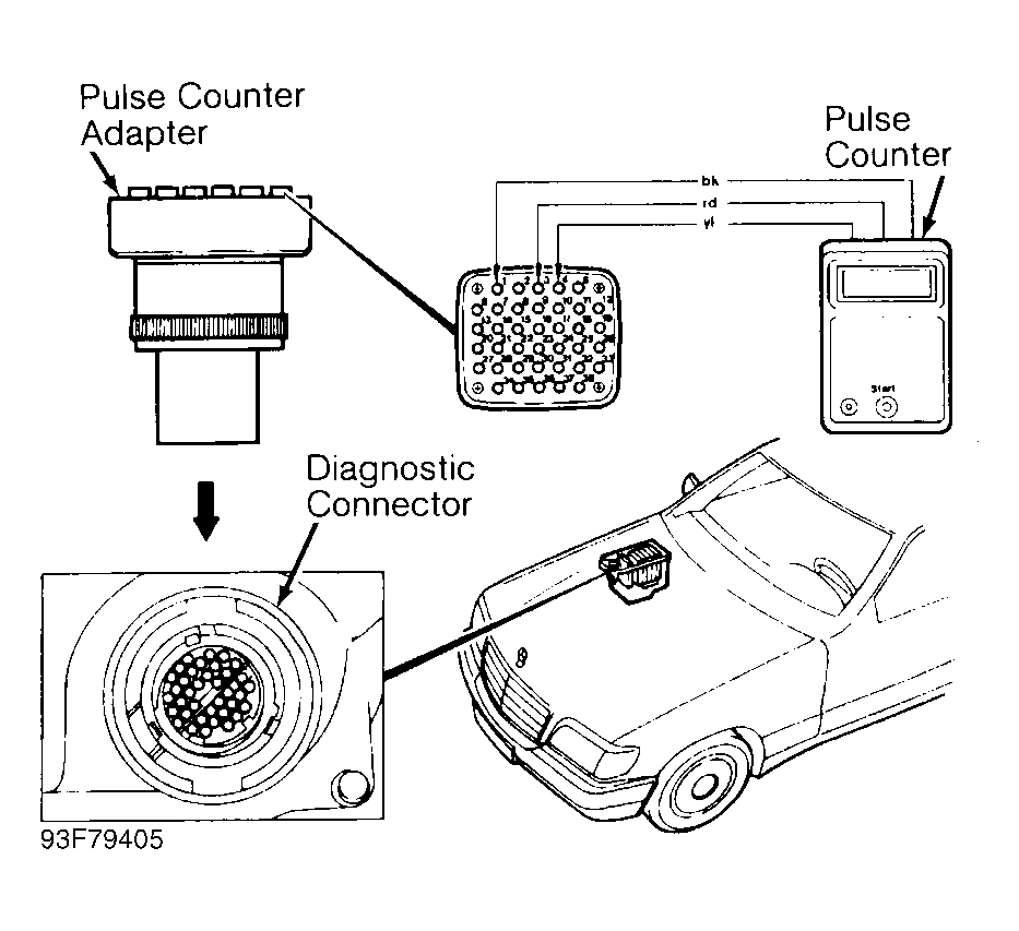 - Turn ignition off. Perform pretest conditions. See PRETEST CONDITIONS . Connect Pulse Counter Adapter (140 589 14 63 00) to diagnostic connector located in right rear corner of engine compartment. Connect Pulse Counter (124 589 19 21 00) to pulse counter adapter. See Fig 1 .