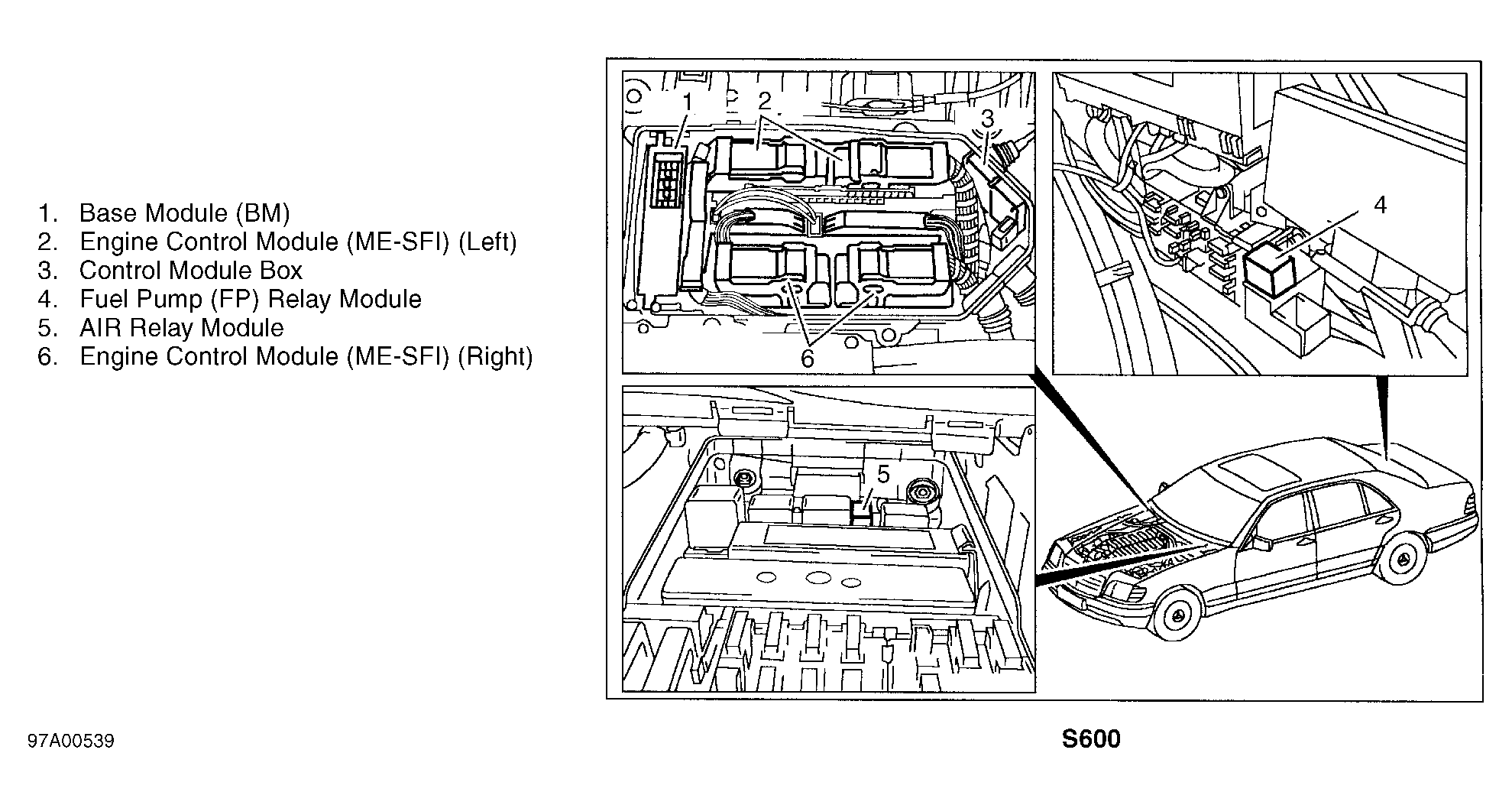 | Engine Control Module (ME-SFI) (Left) (S600) | In module box, on right rear of engine compartment. See Figure . |
