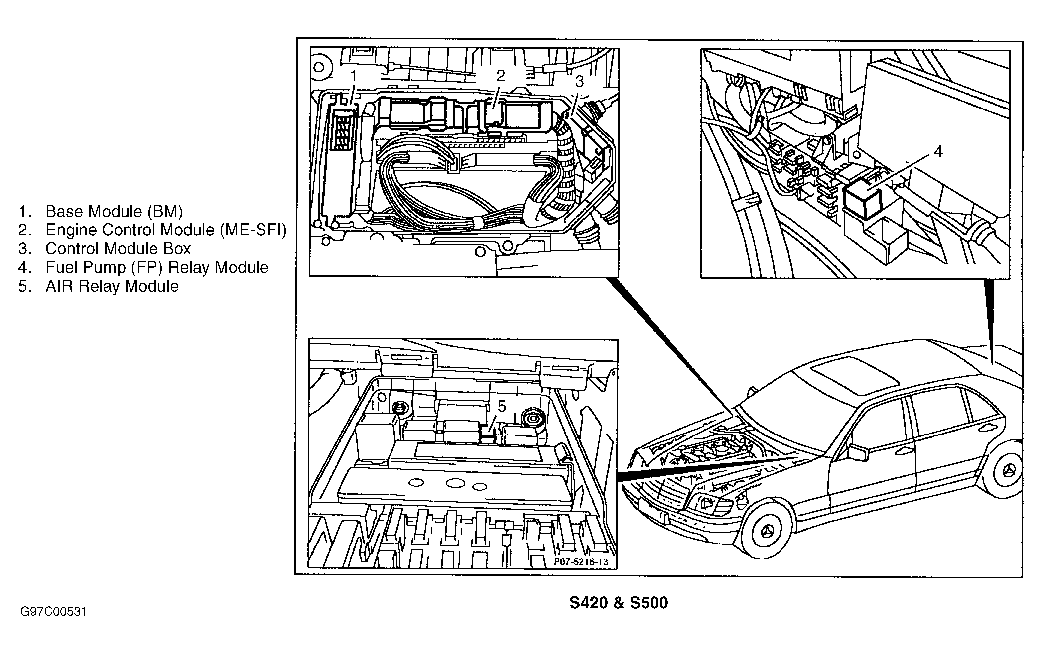 | Fuel Pump (FP) Relay Module (S420 & S500) | On right side of trunk. See Figure . |