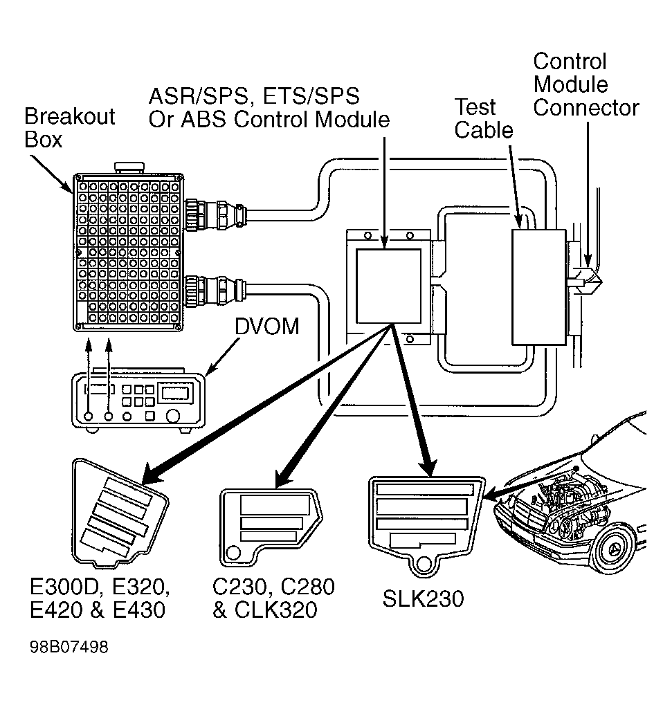 - Using Adapter (202 589 03 63 00), connect Breakout Box (129 589 00 21 00) to traction control module. See Figure, Figure or Figure. Raise and support front of vehicle. Turn ignition switch to RUN position. Check voltage between terminals No. 57 and 77 at breakout box while rotating left front tire by hand faster than one revolution per second. Greater than 3 volts (AC) should exist. If voltage is not as specified, check wiring. See WIRING DIAGRAMS . If wiring is okay, go to next step.