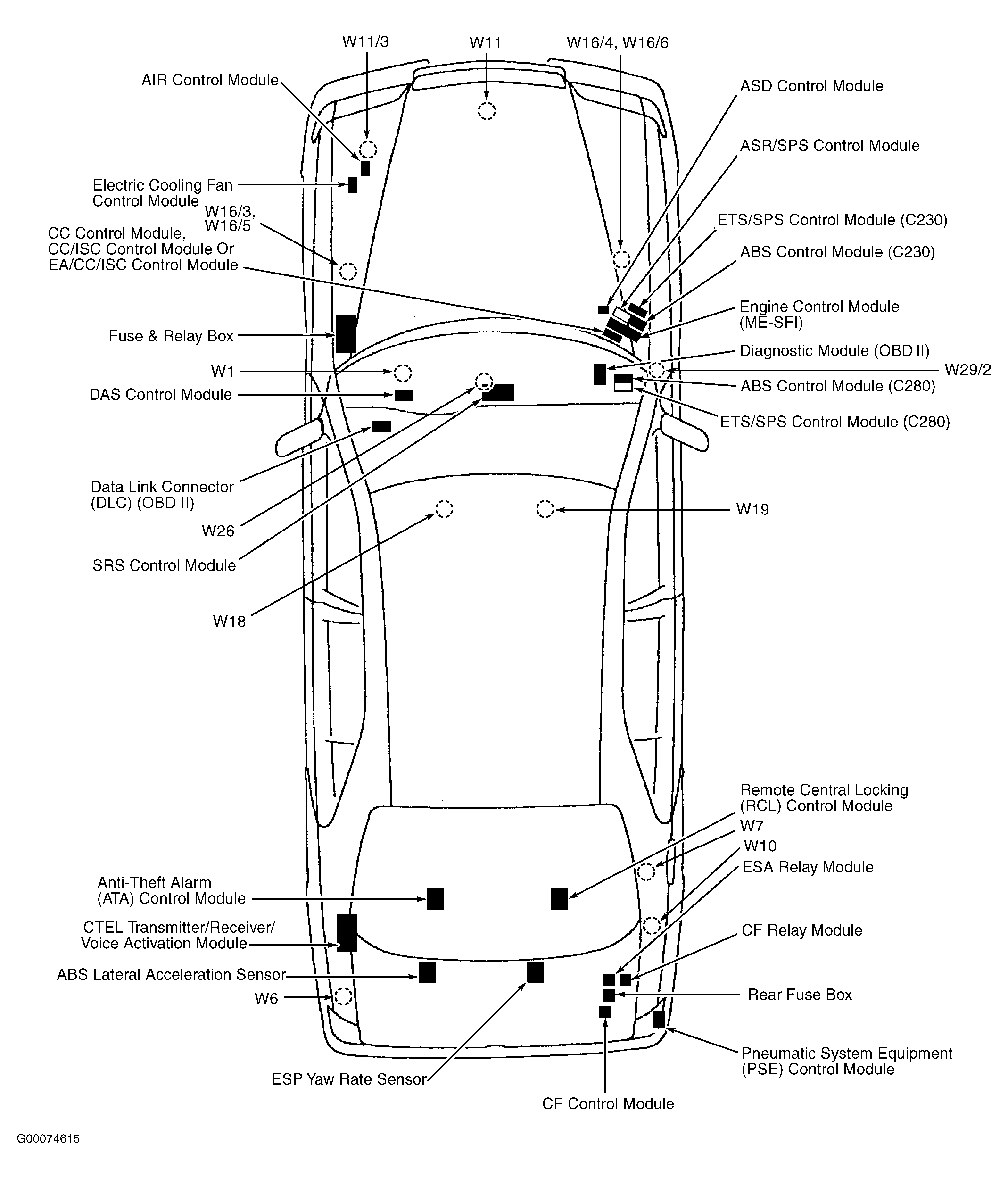 | ABS Control Module (C230) | On right rear of engine compartment. See Figure . |