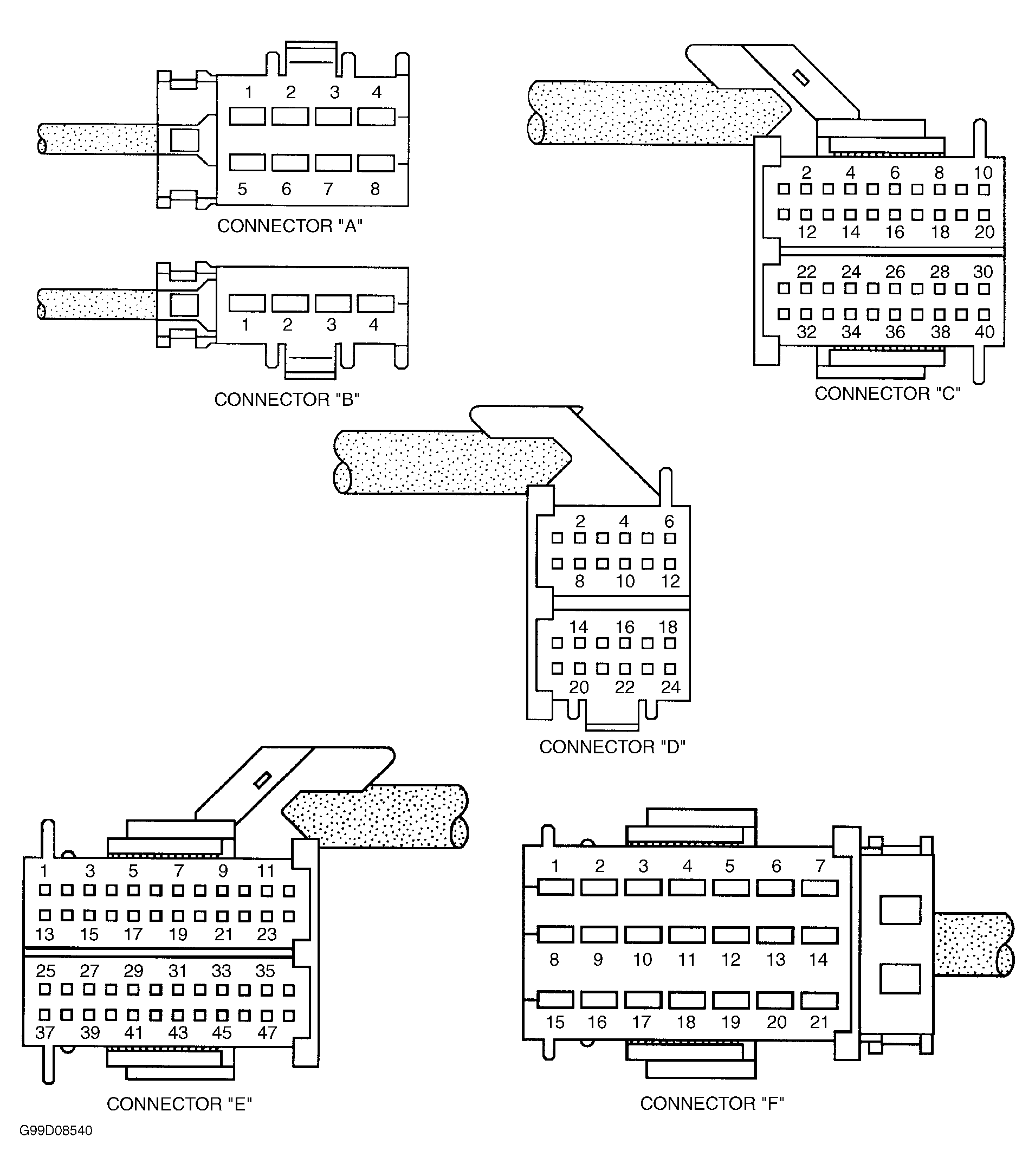 When connecting test equipment, disconnect ME-SFI control module connector "D" first. When reconnecting connectors, connect connector "D" last. See