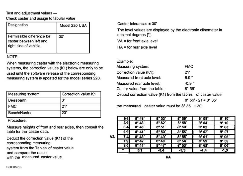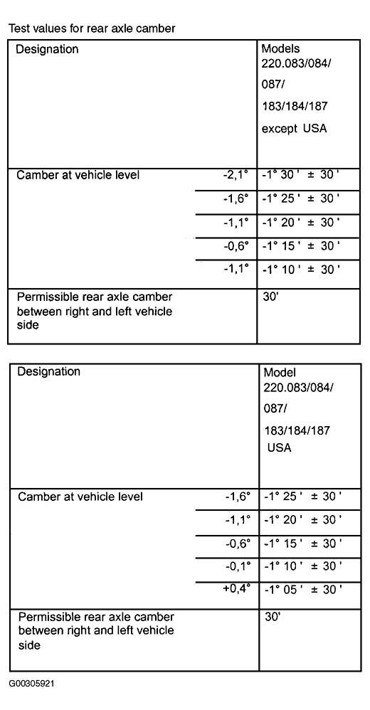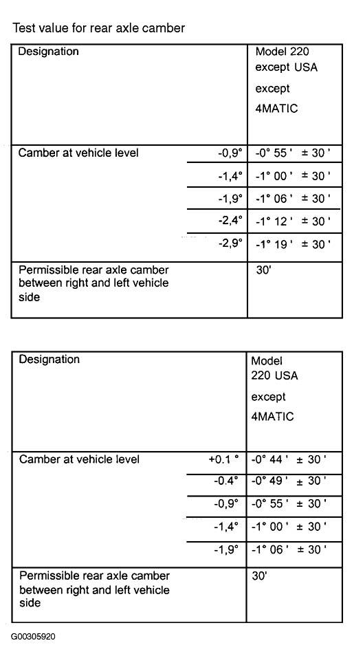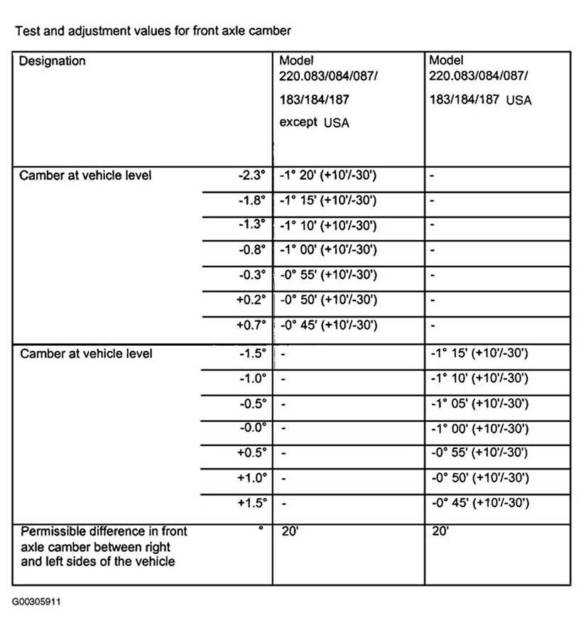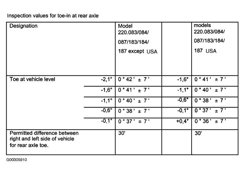 Home >> Mercedes Benz >> 2001 >> S430 >> Repair and Diagnosis >> Suspension >> Wheel Alignment >> Wheel Alignment Specifications & Procedures >> Wheel Alignment Specifications
