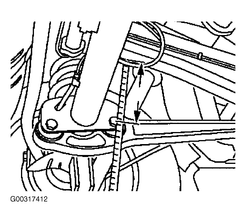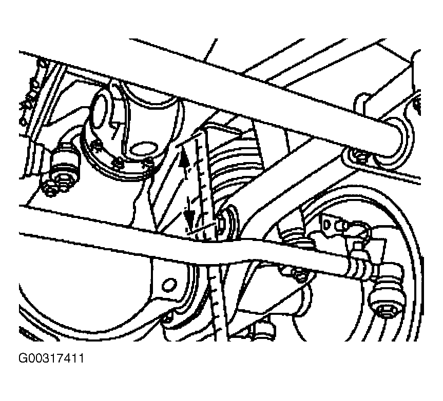 - Measure distance between center of front trailing arm bolt at the rear axle to the bottom edge of the frame cross member (arrows). Enter determined dimension (example, 322 mm), into the nomogram. See Fig 2 . This distance is the supplementary dimension for the rear axle which is required to determining the specified caster value. It has the designation (a).