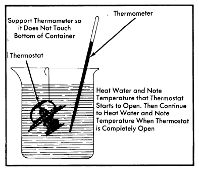 Read temperature on thermometer. This is the initial opening temperature and should be within specifications. Continue heating water until thermostat is fully open and note temperature. This is the fully opened temperature. If either reading is outside of specifications, replace thermostat, as it is not adjustable.