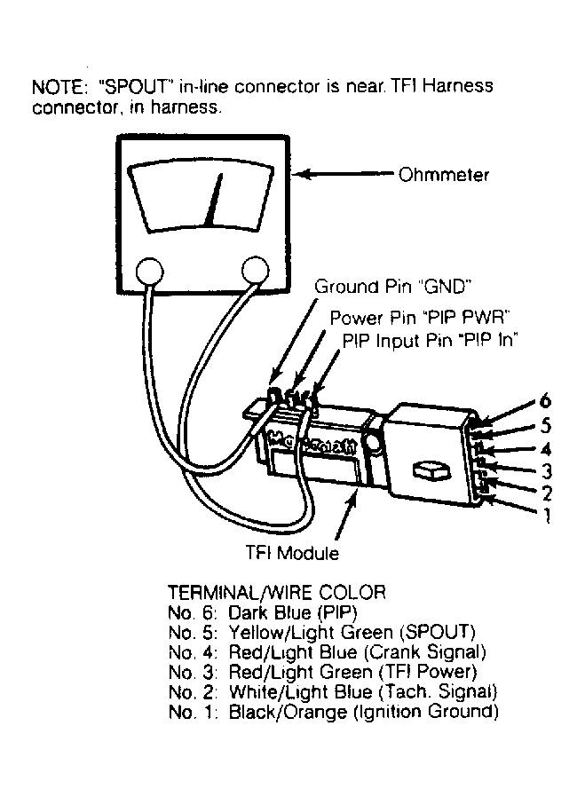 8. If reading in step 2) is not between 0.5 volts and 70% of battery voltage, measure resistance between TFI module terminals "PIP" and "SPOUT".