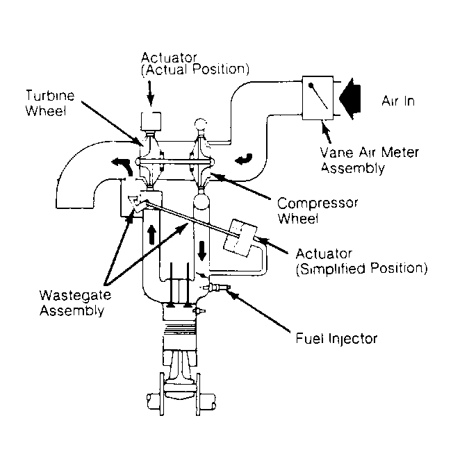 Exhaust gases leave combustion chamber and drive turbine wheel of turbo unit. Turbine speed is controlled by an actuator mounted on turbo unit. The actuator senses intake manifold pressure and controls operation of the wastegate assembly. The wastegate controls amount of exhaust gas entering turbine by opening and closing a by-pass passage, thereby controlling turbine speed and preventing "overboost".