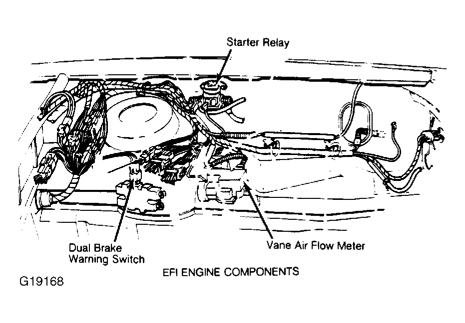 | Vane Air Flow Meter (EFI) | Left fender apron, below starter relay. See Figure. |