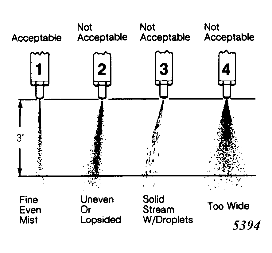 - Operate test pump in smooth, even strokes and observe pattern of spray from tip of injector. The first 3" of spray from injector is important. Spray should be finely atomized in an even, straight pattern. See Fig 1 .