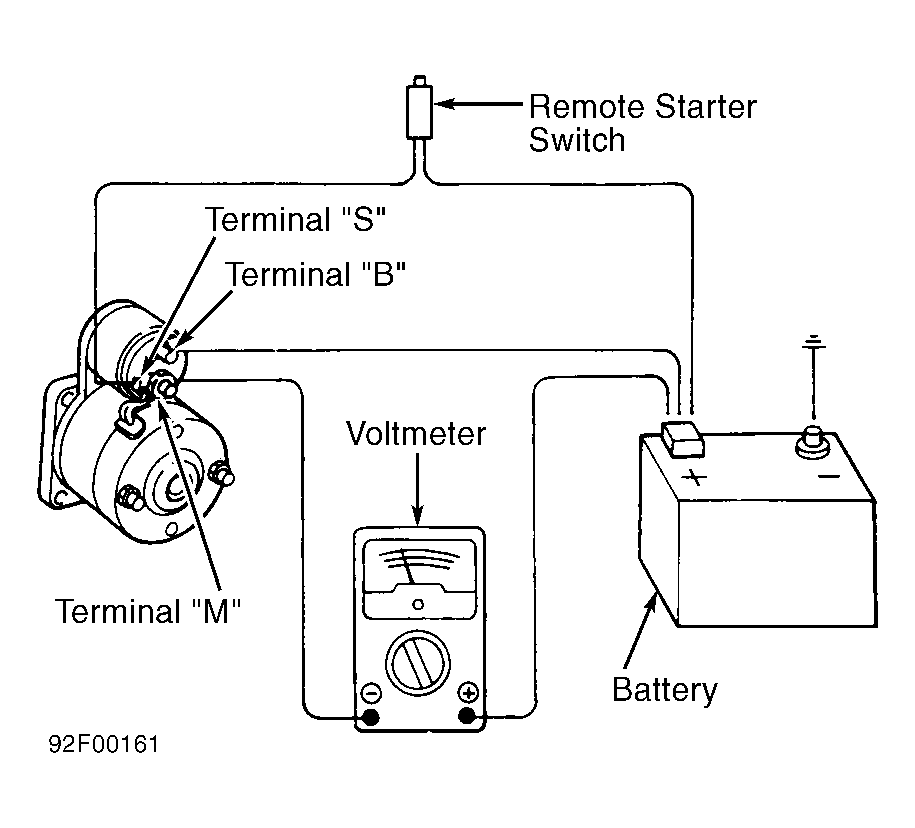 - Engage remote starter switch. Observe voltmeter. Voltmeter indication should be less than 0.5 volt. If voltage at terminal "M" is greater than 0.5 volt, connect negative voltmeter lead to solenoid terminal "B", and repeat test.