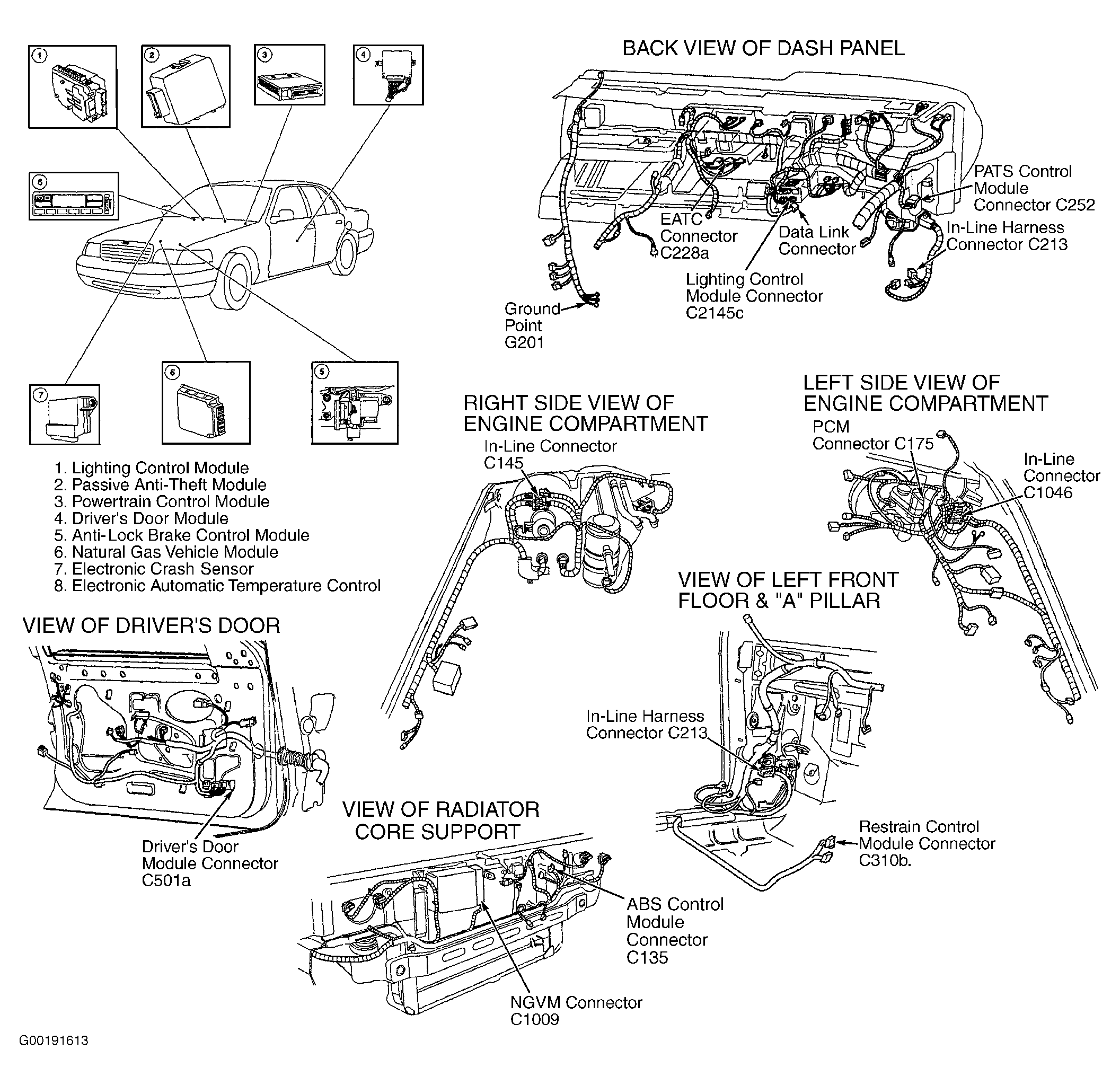- Measure resistance between ground and DLC terminals No. 4 (Black wire) and No. 5 (Black/White wire). If both resistances are 5 ohms or less, repair or replace WDS or NGS tester. If either resistance is greater than 5 ohms, repair open circuit in Black and/or Black/White wire between DLC and ground point G201. Ground point G201 is located behind right side rocker panel. See Figure. See GROUND DISTRIBUTIONGROUND DISTRIBUTION in WIRING DIAGRAMS article in ELECTRICAL. After repair, clear DTCs and test system for normal operation.