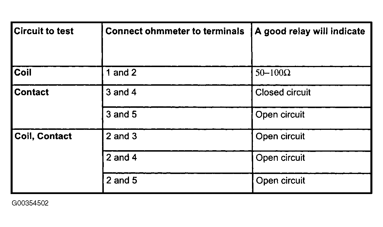 To test the relay, use an ohmmeter to check resistance values between terminals. See Fig 1.