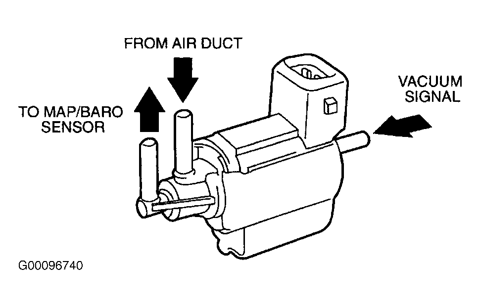 Turn ignition off. Disconnect vacuum lines from MAP/BARO sensor and solenoid. Inspect vacuum lines for restrictions or leaks. Repair or replace as necessary. If vacuum lines are okay, go to next step.