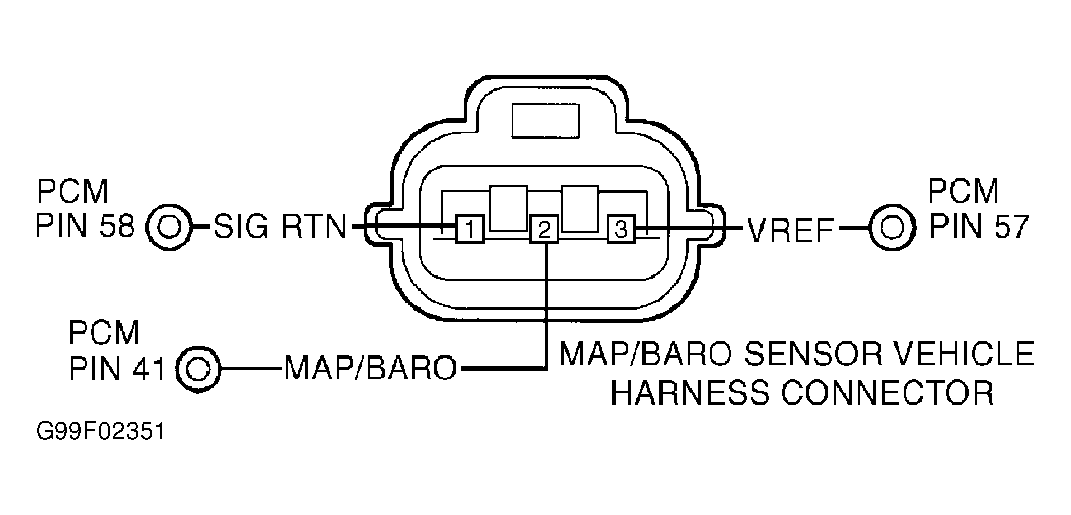 Reconnect PCM harness connector. Turn ignition on. Using DVOM, measure voltage between negative battery terminal and VREF circuit at MAP/BARO sensor harness connector. See Figure. If voltage is 4.5-5.5 volts, go to next step. If voltage is not 4.5-5.5 volts, repair open or short to ground in VREF circuit. See WIRING DIAGRAMS article.