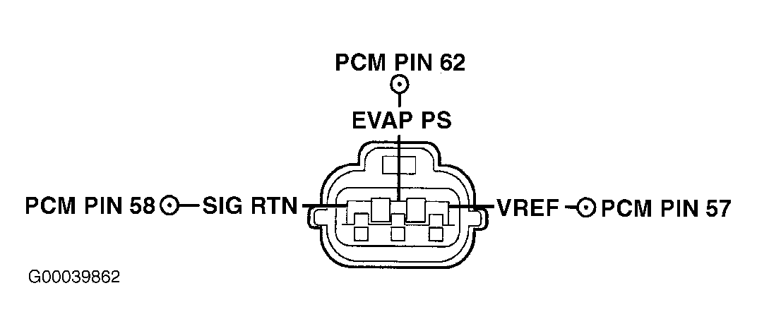 Disconnect PCM harness connector. Inspect connector for damaged pins and repair if necessary. Using DVOM, measure resistance of EVAP PS circuit (Red wire) between PCM harness connector terminal No. 62 and EVAP system pressure sensor harness connector. See Figure and Figure . If resistance is less than 5 ohms, go to next step. If resistance is 5 ohms or more, repair open in Red wire between PCM and EVAP system pressure sensor. See WIRING DIAGRAMS article. - 29) Check EVAP System Pressure Sensor