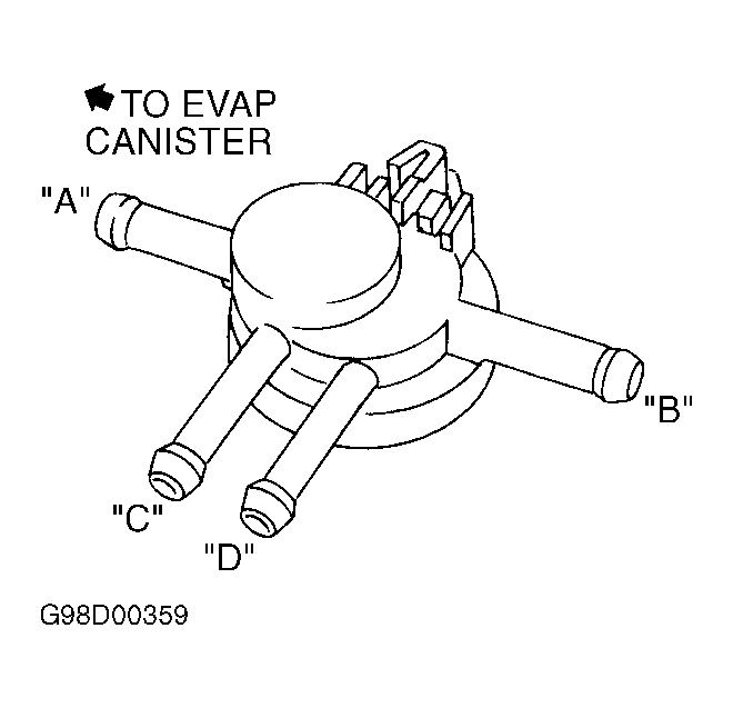 Remove vacuum hoses from vacuum cut valve. Check hoses and repair or replace as necessary. Remove vacuum cut valve. Plug ports "C" and "D" with fingers. See Figure. Apply vacuum to port "A". Vacuum should not exist at port "B". Apply vacuum to port "B". Vacuum should exist at port "A". Blow air into port "B". Air should flow with resistance from port "A". Unplug ports "C" and "D". Blow air into port "A". Air should flow freely from port "C". Blow air into port "B". Air should flow freely from port "D". If air and vacuum flows through EVAP vacuum cut valve as specified, go to next step. If air and vacuum does not flow through EVAP vacuum cut valve as specified, replace EVAP vacuum cut valve. - 89) Check EVAP Canister For Water Saturation