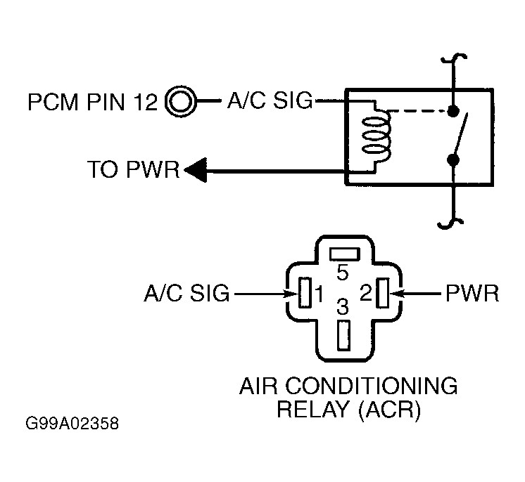 Turn ignition off. Install A/C relay. Disconnect PCM harness connector. Inspect connector for damaged pins and repair if necessary. Turn ignition on. Connect a jumper wire between chassis ground and A/C SIG circuit at PCM harness connector terminal No. 12. See Figure. If A/C relay does not click, go to next step. If A/C relay clicks when A/C SIG circuit is grounded, replace PCM. - 3) Check ACR Circuit For Open