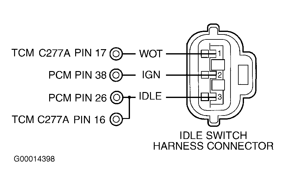 Turn ignition off. Disconnect TCM harness connector C277a. Turn ignition on. Using DVOM, measure voltage between chassis ground and IDLE circuit at TCM harness connector C277a terminal No. 16 (Brown/Yellow wire) while slowly depressing accelerator pedal. See Figure. If voltage is more than 10 volts at closed throttle and less than one volt with accelerator pedal fully depressed, leave ignition on and go to step 11). If voltage is 10 volts or less at closed throttle or one volt or more with accelerator pedal fully depressed, go to next step. - 9) Check TP Switch IGN Circuit For Voltage