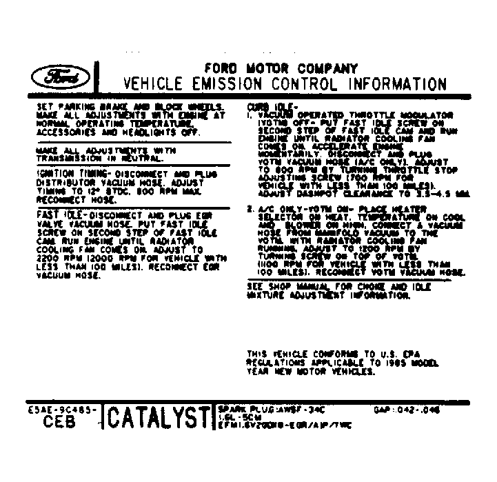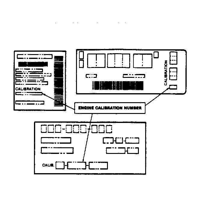 To identify the engine calibration number, locate the engine code label at the front of the engine. Although there are several label styles, the engine calibration number is shown on each. See Fig 1. Calibration codes will begin with a number indicating the current model year. For example, calibrations listed for 1986 Ford vacuum diagrams begin with "6". Each vehicle is also equipped with an emission control data decal applying to that vehicle and its engine. See Fig 2. These decals are usually located on the underside of the hood, or other visible engine compartment location.