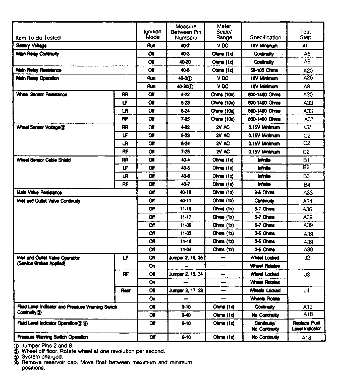 - Turn ignition off. Depress brake pedal at least 20 times to depressurize brake system. Disconnect 5-pin pressure warning switch. Check for continuity between pressure warning switch terminals No. 1 and 4. If continuity is present, go to next step. If continuity is not present, replace pressure warning switch, diode and pump motor relay.