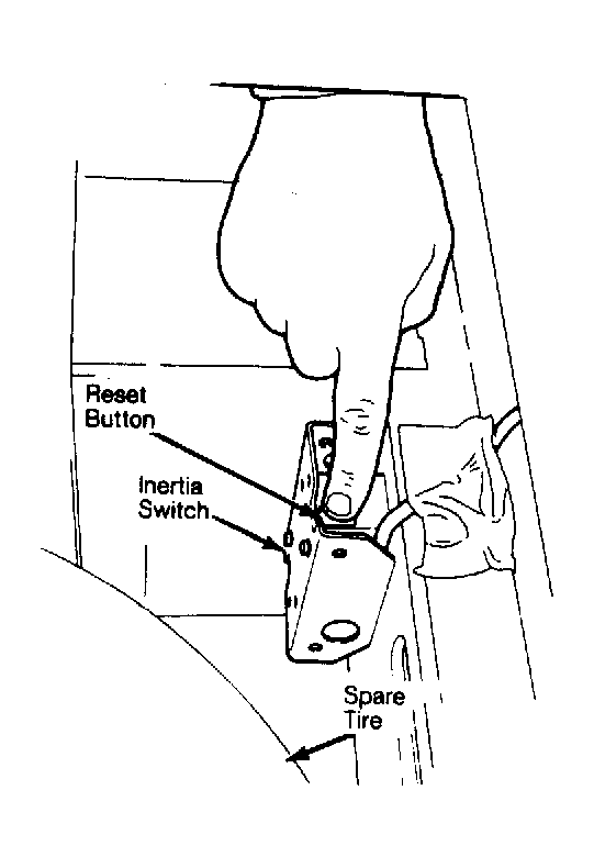 If the inertia switch is tripped, the engine stops running and cannot be restarted until it is reset. On Merkur XR4Ti, to reset switch, open liftgate and fold floor covering back for access to spare tire well. Press button on top of the inertia switch. See Fig 1 .