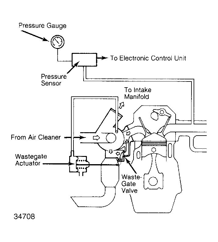 The pressure actuated wastegate, located at the front of the compressor housing, prevents excessive intake boost pressure. An additional safety feature is provided by the fuel injection Electronic Control Unit (ECU). The ECU will modify fuel injection pulse width when it senses intake manifold pressures that are higher than normal.