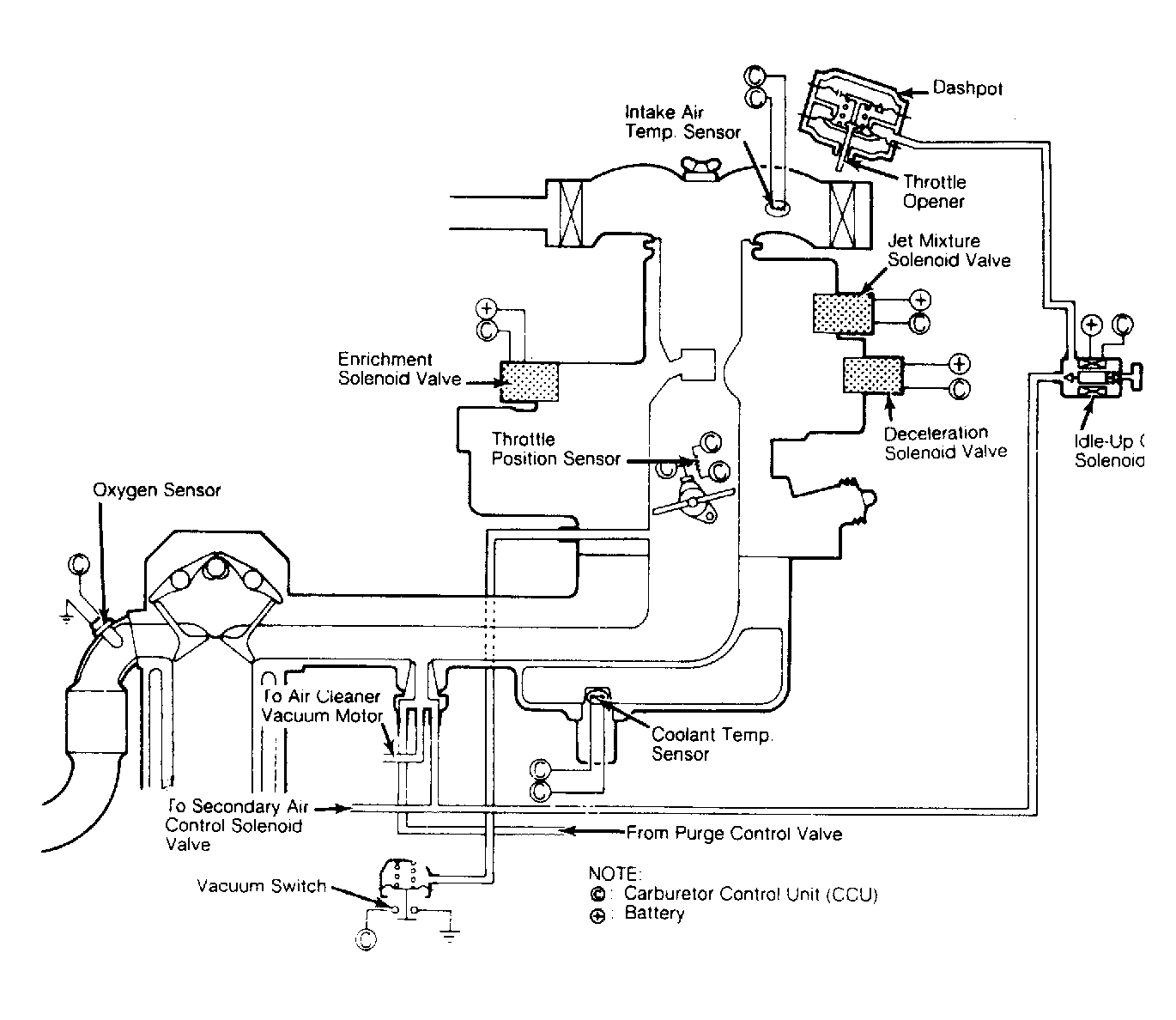 - Turn ignition switch to "OFF" position. Remove harness connectors "A" and "B" from Carburetor Control Unit (CCU). See Fig 1 .