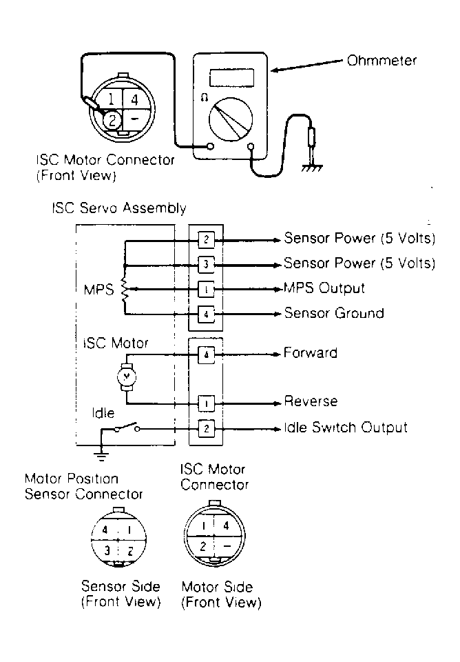 - On all models except Cordia and Tredia, use 4 flashlight batteries (6 volts) and apply negative and positive voltage between terminals No. 1 and 4. See Fig 2 . Ensure ISC servo extends and retracts as necessary.