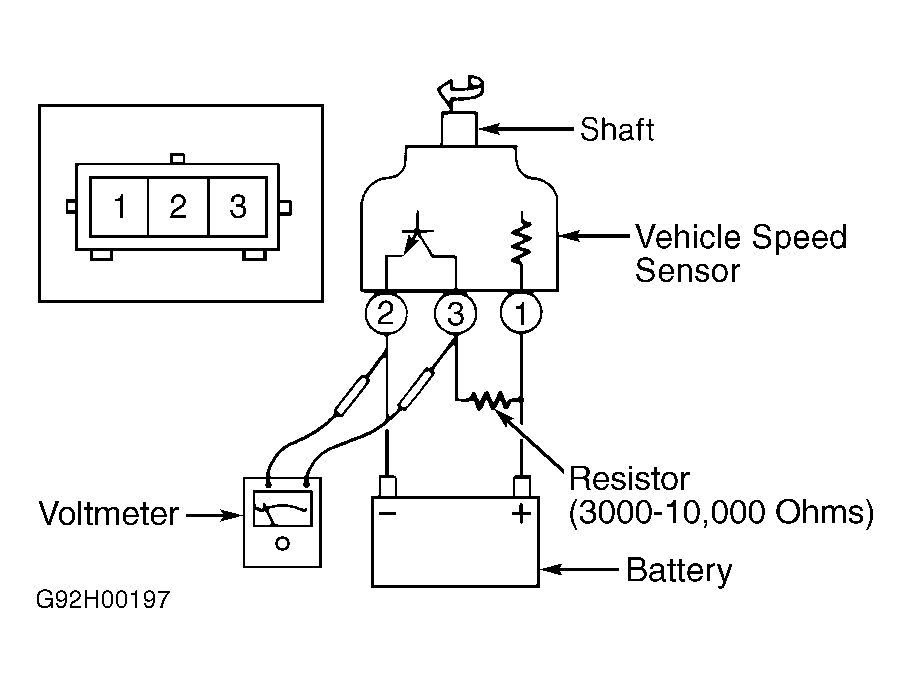 - Remove vehicle speed sensor from transaxle. Jumper a 3000-10,000 ohm resistor between sensor terminals No. 1 and 3. Connect battery positive to sensor terminal No. 1 and battery negative to sensor terminal No. 2. See Fig 1 .