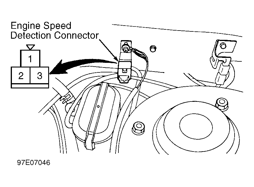 - Start engine and warm engine until engine temperature coolant is 176-203°F (80-95°C). Turn engine off. Insert a paper clip in engine speed detection connector terminal No. 3. See Fig 1