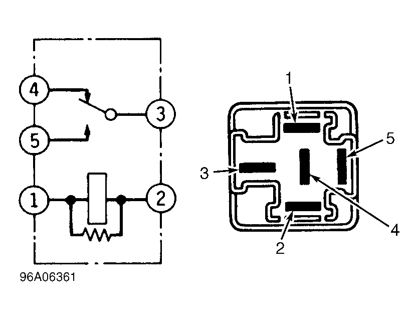 - Connect a jumper wire from positive battery terminal to relay terminal No. 1 and another jumper wire from negative battery terminal to relay terminal No. 2. Continuity should exist between relay terminals No. 4 and 5. See Fig 1 .