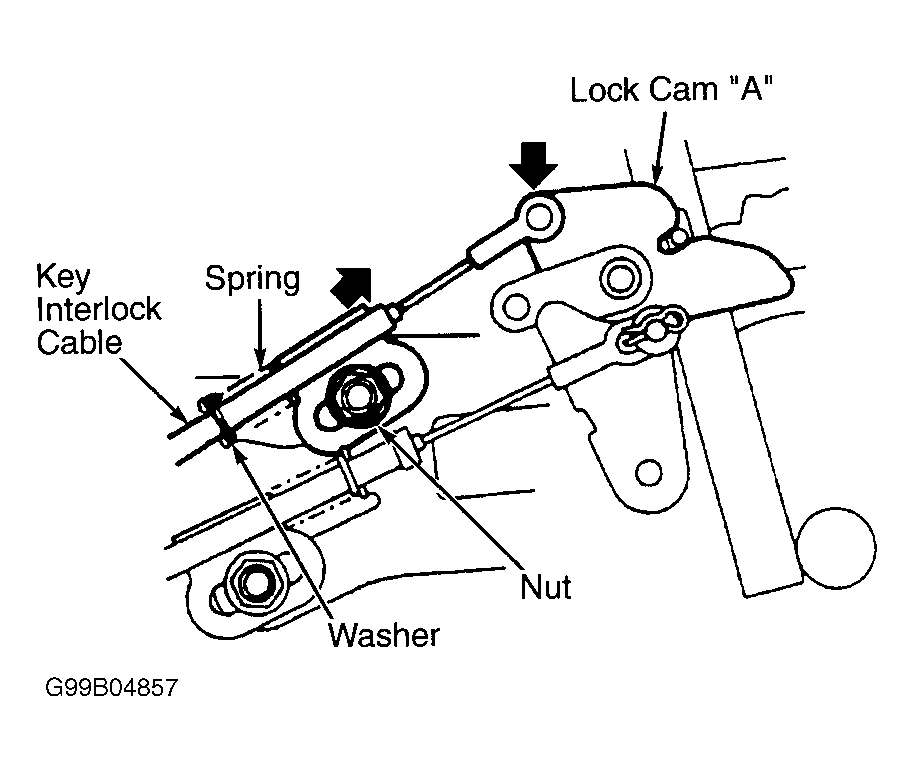 Remove front console assembly. Move selector lever to "P". Loosen nut securing key interlock cable. Gently press lock cam "A" down while pushing cable to take up slack. See Fig 1. Tighten nut to specifications to secure cable. See TORQUE SPECIFICATIONS .