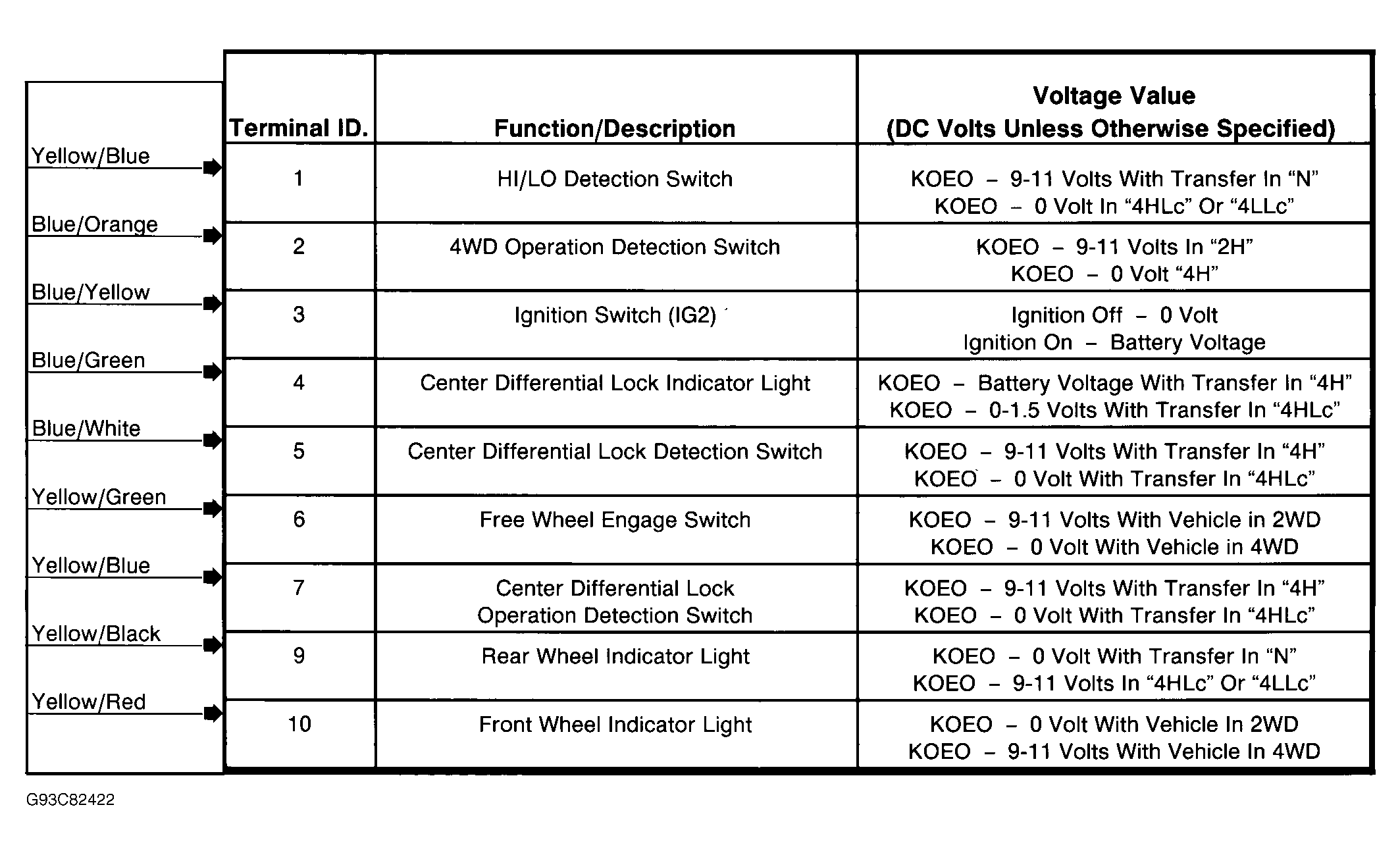 Remove radio and remove 4WD control unit. Disconnect control unit harness connector. Backprobe harness connector. Check voltage between each individual terminal and ground terminal No. 8 (Black wire). See Fig 1 and Fig 2 . If after all tests have been completed system is not operating properly, substitute 4WD control unit with known-good unit and retest.