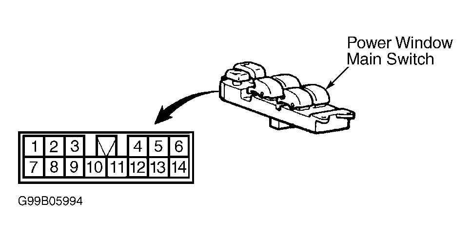 Remove power window main switch from trim panel. Apply battery positive voltage to switch terminal No. 13. Apply ground to switch terminal No. 12. See Figure . Continuity should be present at specified terminals. See POWER WINDOW MAIN SWITCH CONTINUITY table. If continuity is not as specified, replace power window main switch.