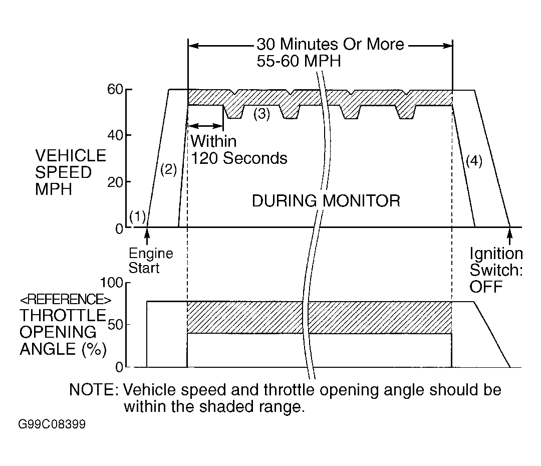 - Drive at 55-60 MPH for 30 minutes or more (M/T: 5th gear). During this period DO NOT drive at constant speed for more than 120 seconds. Carry out gradual deceleration and acceleration within every 120 second time frame. Depressing brake pedal is okay, but avoid abrupt braking.