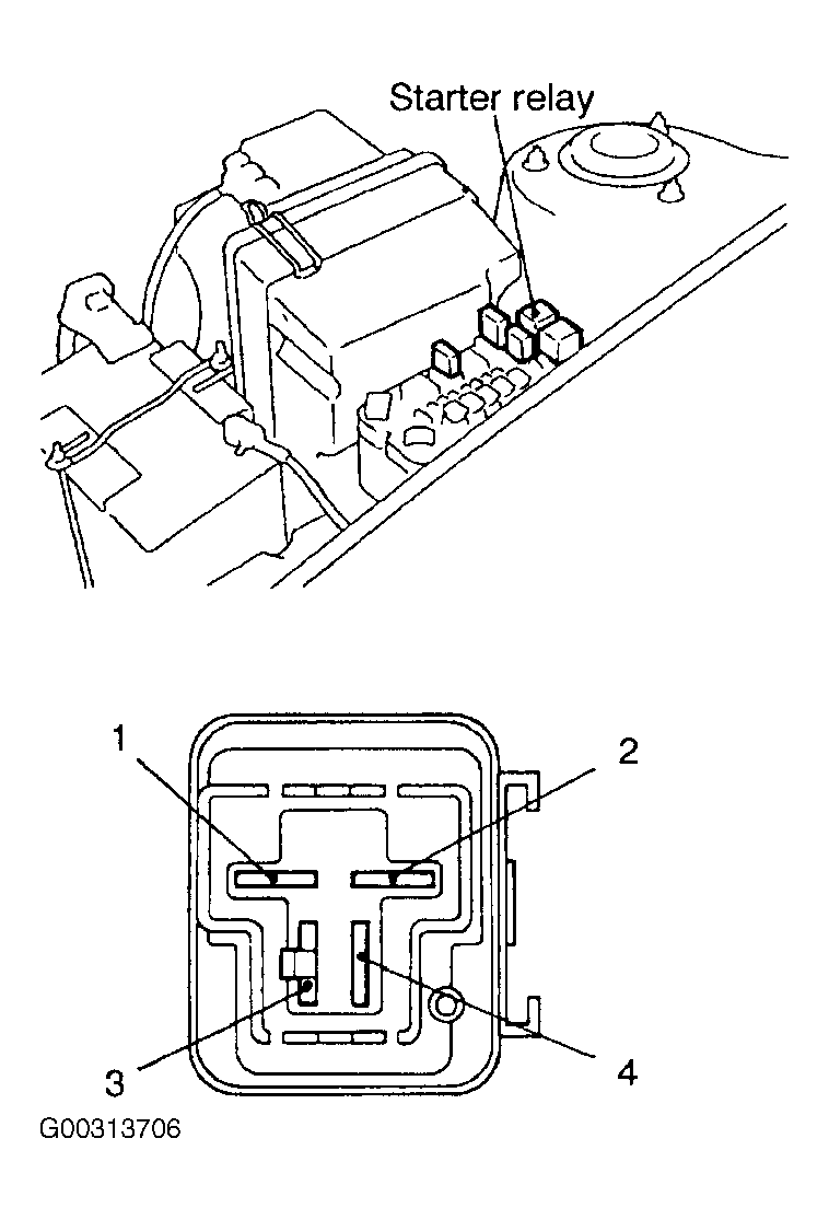 Remove starter relay. See Fig 1 . Connect positive ohmmeter lead to terminal No. 4. Connect negative ohmmeter lead to terminal No. 2. Continuity should exist. Connect positive ohmmeter lead to terminal No. 2. Connect negative ohmmeter lead to terminal No. 4. Continuity should not exist. If continuity is not as specified, replace relay.